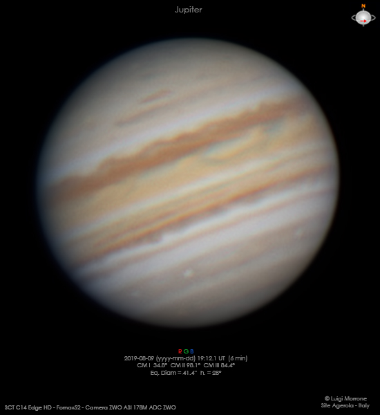Ormai il gigante per le nostre latitudini diventa sempre più difficile poterlo riprenderlo, ma le ottime condizioni mi hanno permesso di poter effettuare una sessione dopo il tramonto. Nella NNTB su può osservare una striscia scura.