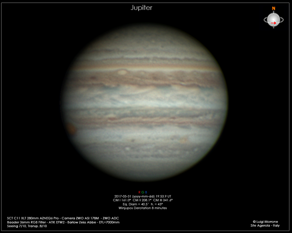 Ripresa di Giove con C11 XLT 280mm, Camera ASI 178M, AZ-NEQ6. Condizioni meteo caratterizzate da buon seeing. La GRS è appena visibile sulla destra, mentre l’ovale BA risulta visibile sulla lato in basso a sinistra.