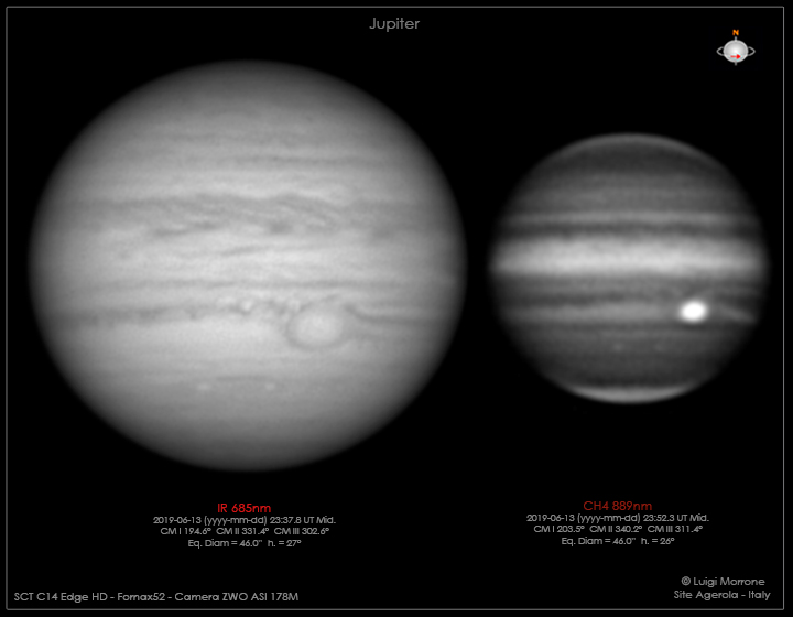 Giove ripreso nel vicino infrarosso (IR685nm) e nella banda del metano (889nm).