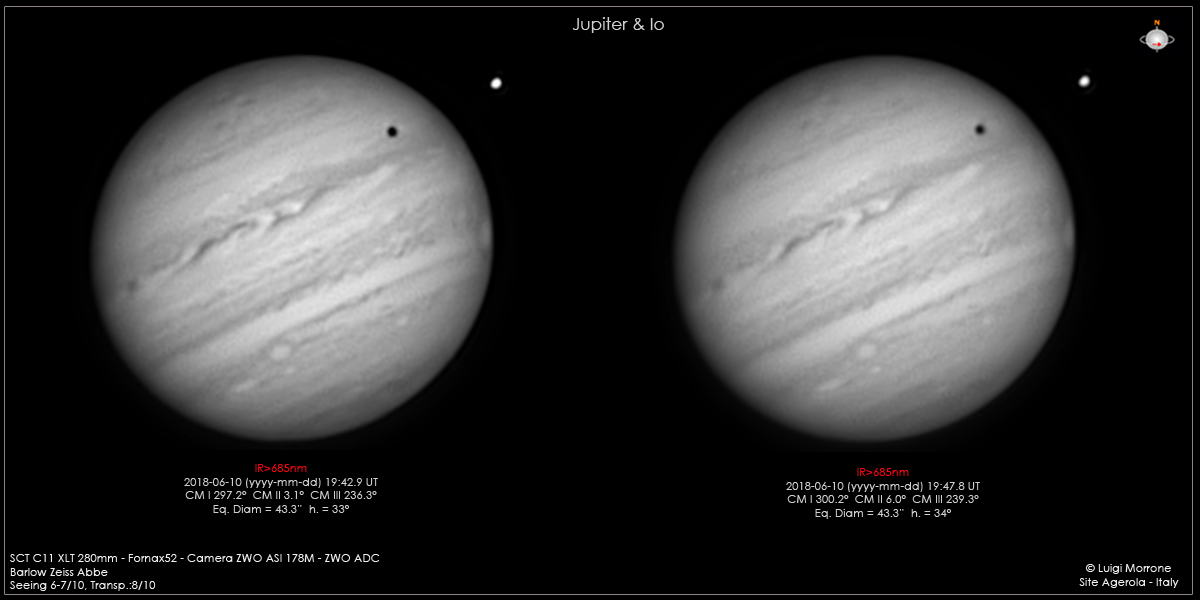 Ripresa di Giove e del satellite Io nella banda dell’infrarosso. Da notare l’ombra della luna proiettata sul disco planetario.