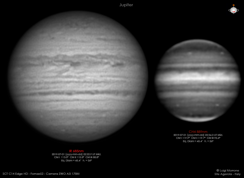 Ripresa di Giove nel vicino infrarosso e nella banda del metano. In IR visibili diversi dettagli, tra cui macchie scure nella regioni polari. La ripresa nel CH4 permette di effettuare una diagnostica della quota delle nubi: più un fenomeno è brillante, più si trova sopra lo strato assorbente di questo gas.
