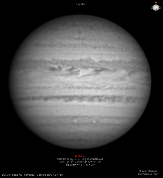 Diversi dettagli visibili dalla regione equatoriale alle zone polari. La SEB mostra un’intensa attività sulla componente sud, a differenza di quella nord meno marcata.