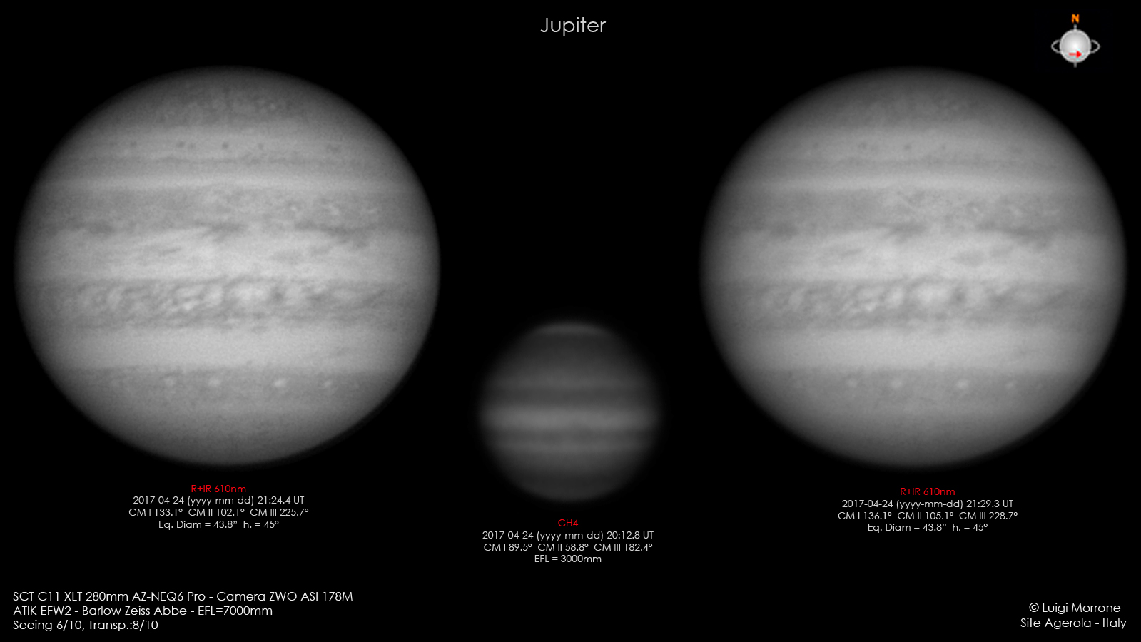 Ripresa di Giove con C11 XLT 280mm, Camera ASI 178M, AZ-NEQ6. Condizioni meteo caratterizzate da buona trasparenza.