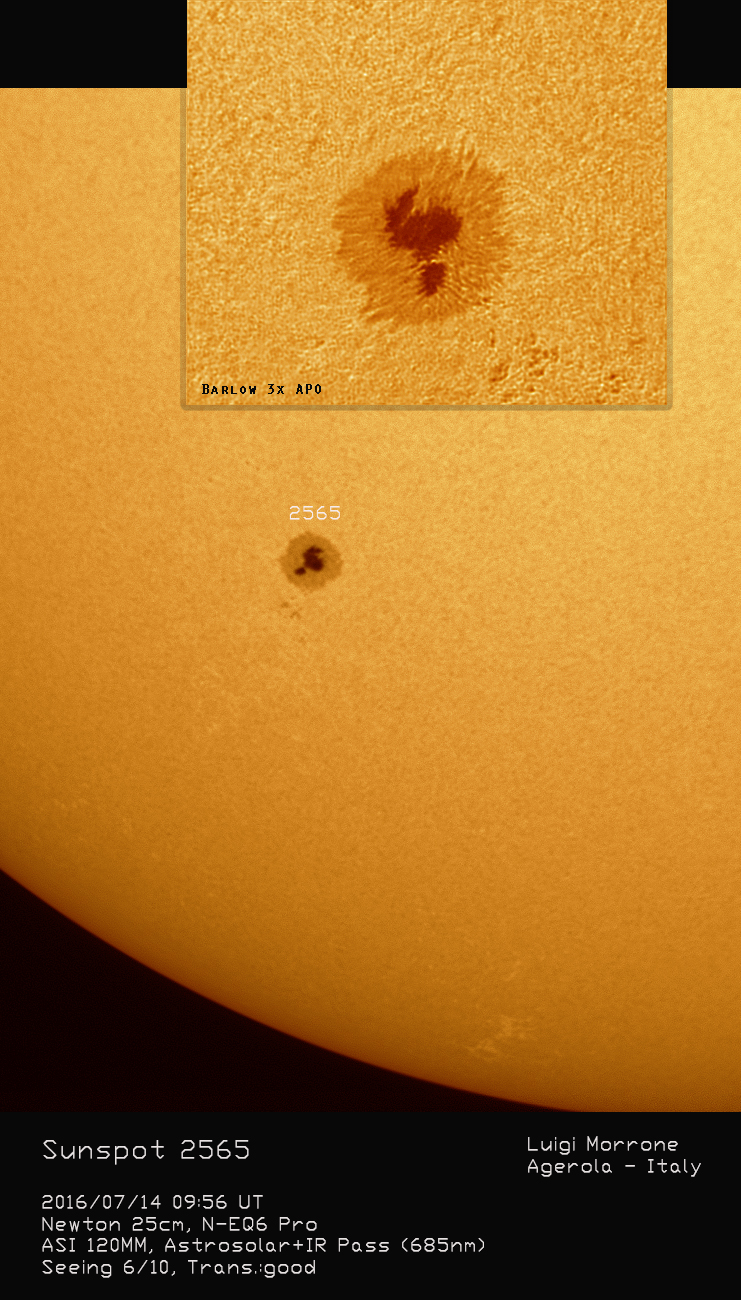 Macchia Solare AR2565 ripresa con Newton 10".Nell’immagine a fuoco diretto si possono osservare le facolae, ovvero regioni di dimensioni contenute, più calde dell’ambiente circostante, quindi più luminose. Il dettaglio, invece, mostra la macchia con la zona d’ombra, la penombra e i filamenti. Evidenti risultano i granuli, ovvero immense sacche di gas che attraverso moti convettivi salgono in superficie e quando raggiungono la fotosfera, diminuiscono la propria temperatura, aumenta la densità e sprofondano di nuovo.
