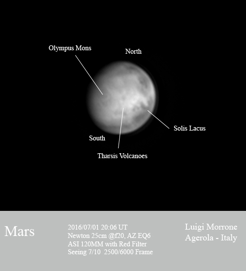 Vi propongo una ripresa di Marte effettuata qualche giorno fa. Il pianeta rosso durante l’acquisizione si mostrava con una fase del 93%. Per aumentare il contrasto dei dettagli superficiali ho utilizzato un filtro rosso. La scala d’immagine, nonostante sia stato utilizzato un Newton 25cm, è abbastanza dettagliata. Sono evidenti le regioni della Solis Lacus (occhio di Marte) per la sua forma caratteristica, la regione Tharsis con i suoi grandi vulcano ed il famoso Monte Olimpo con i suoi 20km di altezza. Tuttavia sebbene il Monte Olimpo sia stato spodestato come vulcano più alto del sistema solare (più alto il monte Rheasilivia dell’asteroide Vesta) resta il più massiccio con una base larga 600km ed una caldera di 80km.