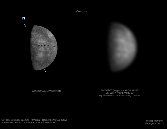 I dettagli ripresi mostrano una buona correlazione con la simulazione effetauata in WinJupos. Oltre alla presenza di alune macchie di albedo – crateri a raggiera-, sul bordo in alto a destra è possibile osservare il grande bacino Colaris.