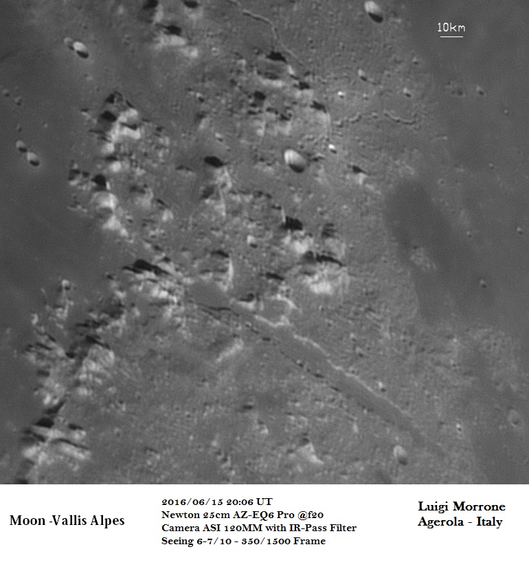 Vi propongo un nuovo dettaglio lunare, ovvero la famosa fenditura che attraversa la catena montuosa delle Alpi e per questo nominata Valle delle Alpi. In passato si pensava che fosse stata provocata da un passaggio di un meteorite passato di striscio, ma oggi sappiamo che è stata causata dal "raggrinzimento" della crosta selenica.