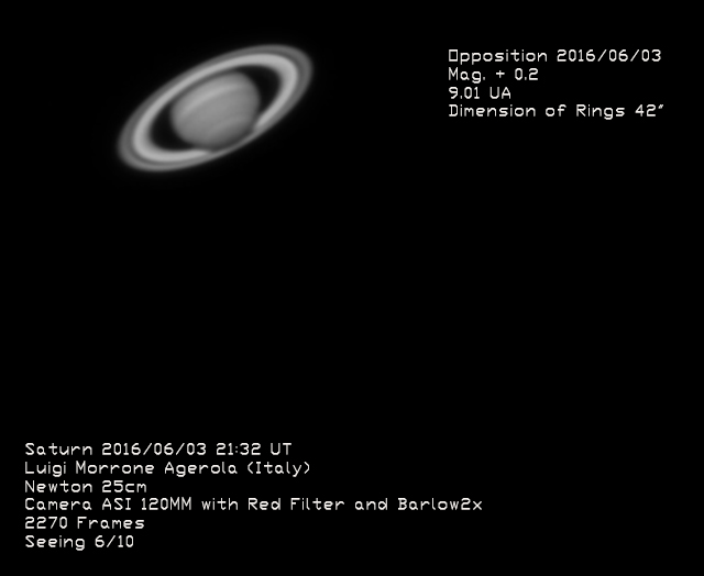 Vi propongo, forse con un pò di ritardo, il momento dell’opposizione di Saturno. La posizione del pianeta hanno reso un pò complicata la ripresa, ma alla fine sono evidenti la divisione Cassini e le caratteristiche bande del pianeta. Ho preferito usare un filtro long pass (610nm) per mitigare gli effetti del seeing. Mediati 2270 frame su un totale di circa 5000. Stacking con AS2 (Autostakkert), elaborazione con Iris e PS.