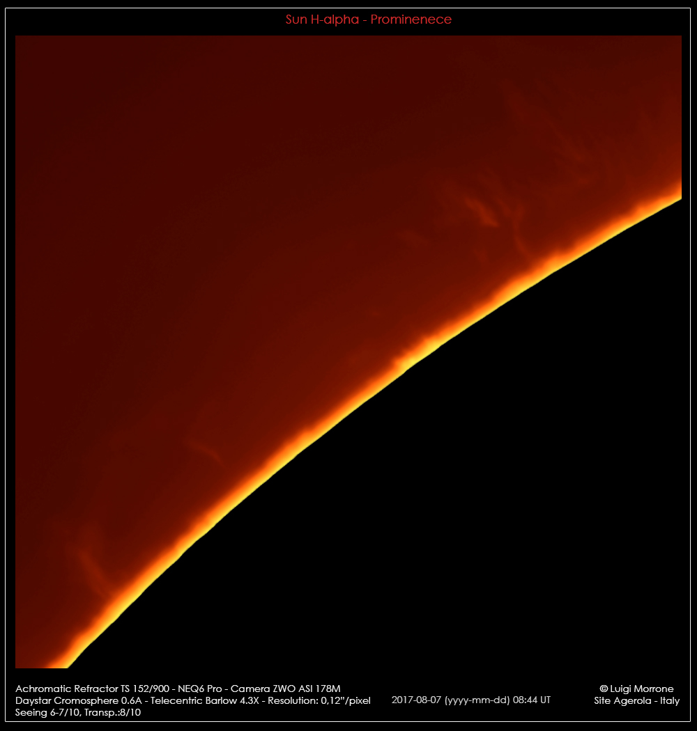 Protuberanza solare in H-Alpha con rifrattore acromatico 152/900 e filtro Daystar Quark Cromosphere 0,6A. Ripresa effettuata da Agerola-Costiera Amalfitana-B&B Nido degli Dei