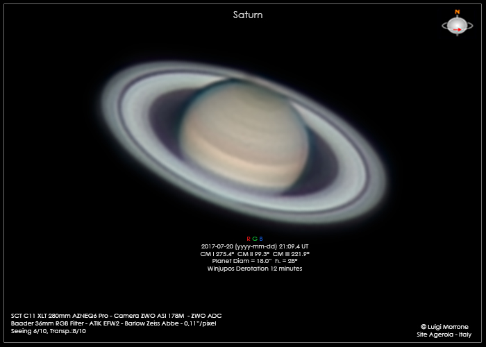 Ripresa del Signore degli Anelli con C11 XLT 280mm, Camera ASI 178M, AZ-NEQ6 e correttore di dispersione atmosferica ZWO ADC. Seeing nella media con trasparenza abbastanza buona.