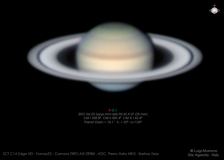 Average seeing conditions with poor transparecy. To note the bluish color of the southern polar region due to the changing Saturn’s seasons, in particular it come out of the winter. No relevant atmospheric events has been observed.