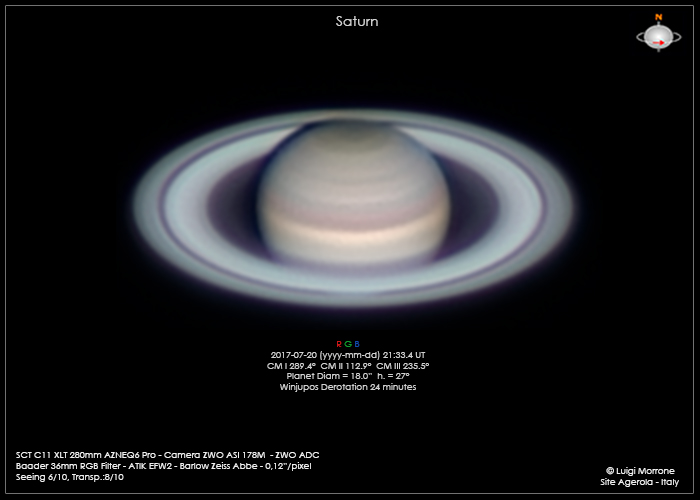 Ripresa del Signore degli Anelli con C11 XLT 280mm, Camera ASI 178M, AZ-NEQ6 e correttore di dispersione atmosferica ZWO ADC. Seeing nella media con trasparenza abbastanza buona.
