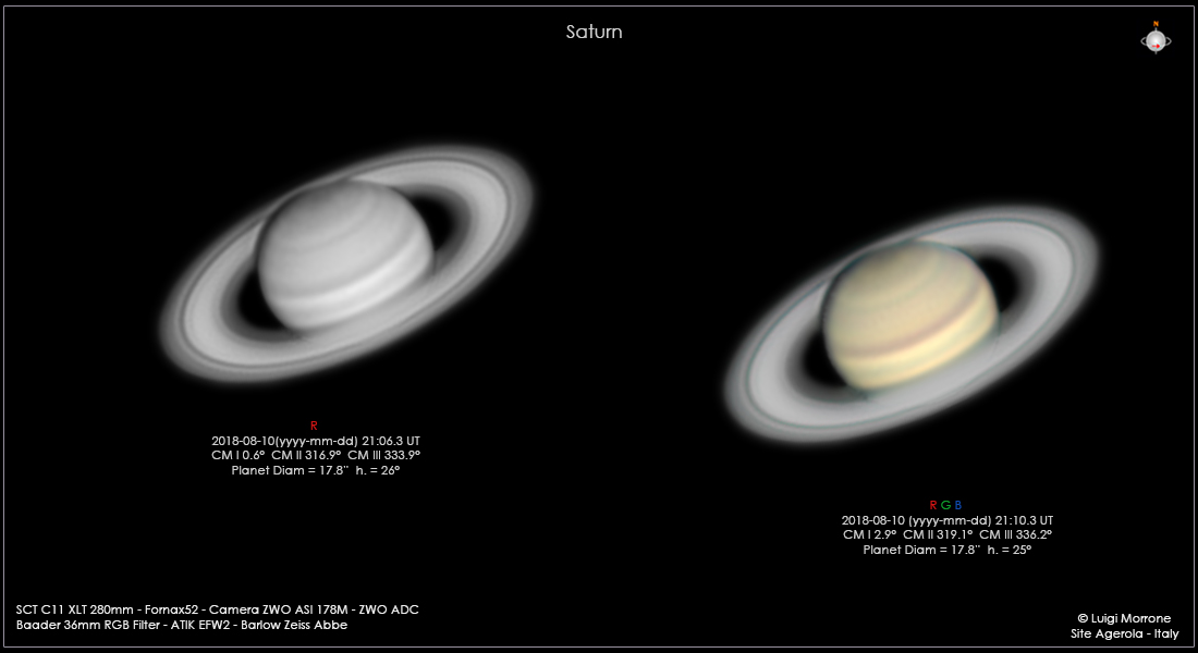 Ripresa di Saturno con condizioni di buon seeing a tratti. L’immagine è stata ottenuta attraverso diversi set RGB per un totale di 48minuti di acquisizione. Per compensare gli effetti della rotazione è stata usata utilizzata la tecnica della derotazione.
