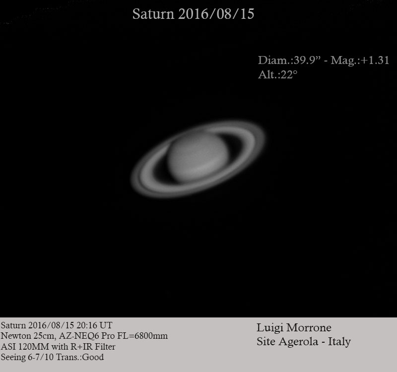Ripresa di Saturno il giorno di Ferragosto con Newton 25cm, camera ASI MM con filtro Red Long Pass a 610nm e montatura AZ-NEQ6 Pro. Il pianeta, ormai difficile da poter riprendere, vista la sua posizione, regala sempre il suo fascino.