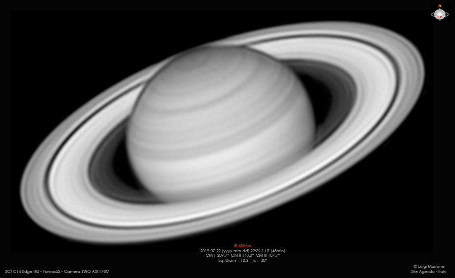 Saturno ripreso con ottimo seeing. Diversi dettagli visibili sia sul globo che sul sistema di anelli.
