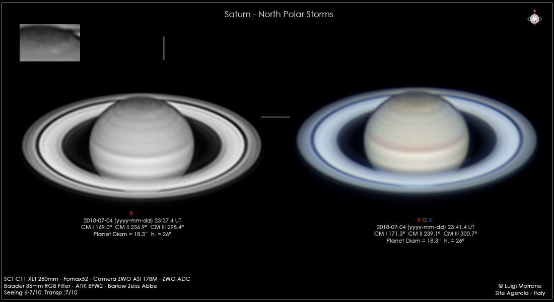 Ripresa di Saturno con una tempesta visibile nella regione polare Nord. Nel canale R visibile dettagli maggiori, compreso l’Esagono Polare.
