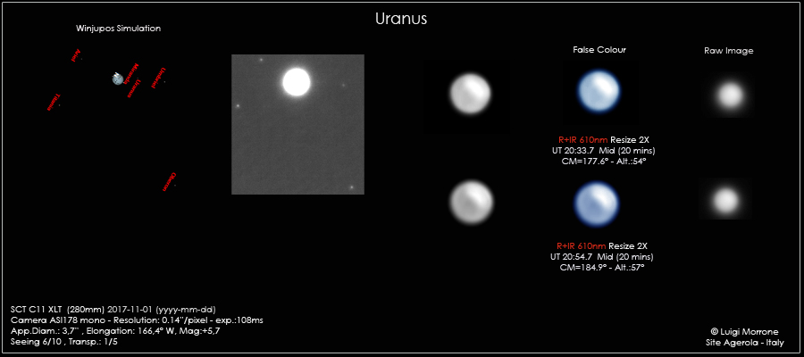 Urano e le sue lune. Si tratta di due sessioni, ognuna di 20 minuti, effettuate con un campionamento di 0.14"/pixel.