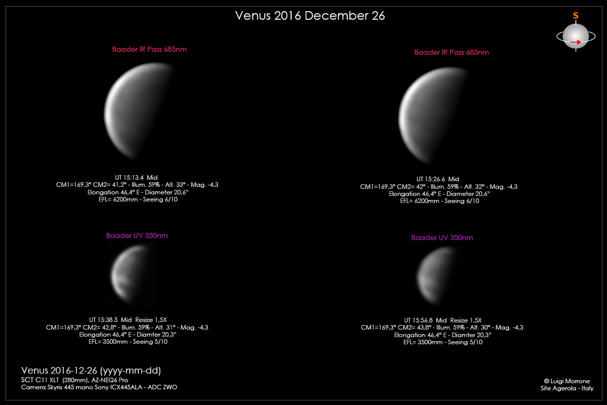 Ripresa di Venere con SCT C11 XLT, ccd Skyris 445M e filtri IR e UV pass. In IR si riescono ad intravedere leggere velature dell’atmosfera, mentre nella banda dell’ultravioletto nella regione polare nord abbastanza evidenti le nubi.