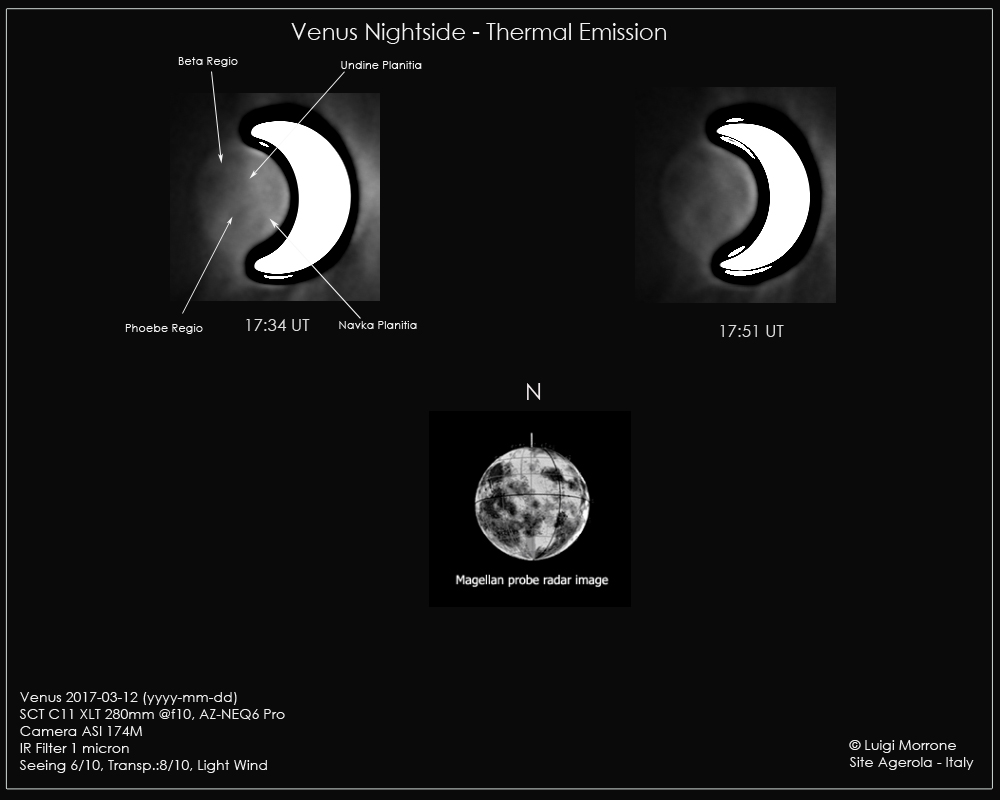 Probabili dettagli della superficie Venusiana analizzando l’emissione termica dell’emisfero non illuminato. Alla lunghezza d’onda di 1 micron si trova una finestra di trasparenza nello spettro dell’anidride carbonica e nello strato di nubi di acido solforico, all’intero della quale la radiazione termica proveniente dalla superficie riesce ad uscire nello spazio ed è possibile riprendere macro dettagli.