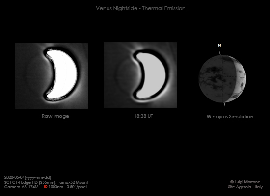 La ripresa è stata effettuata con discrete condizioni di seeing ed ottima trasparenza. L’emissione termica della superficie di Venere può essere catturata dalla Terra usando un filtro IR da 1 micron. A questa lunghezza d’onda la sua atmosfera risulta trasparente e il suo segnale termico può essere ripreso con camere CCD e CMOS. Nell’immagine sono visibili alcune macchie scure. Queste potrebbero corrispondere ad alcune montagne e rilievi della superficie venusiana.