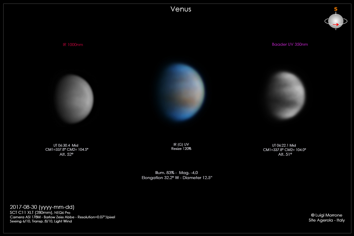 Ripresa di Venere nell’Ultravioletto (filtro UV Baader 350nm) e nell’Infrarosso (1000nmn). Fase all’82% e massima elongazione ovest 32%.