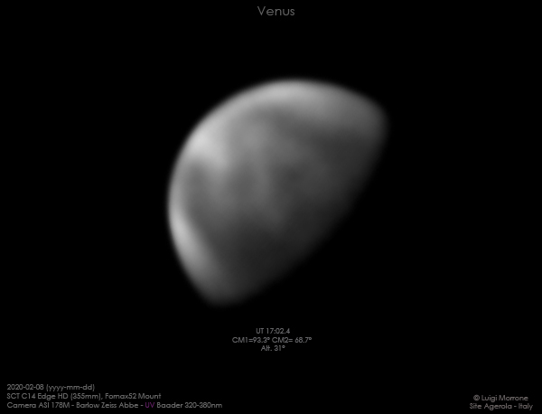 Immagine di Venere effettuata nel vicino ultravioletto con filtro UV Baader 320-380nm. Interessante risulta la struttura nuvolsa ripresa a questa lunghezza d’onda. A questa banda si osservazione i sistemi nuvolosi sono collocati a circa 80km dalla superficie venusiana.