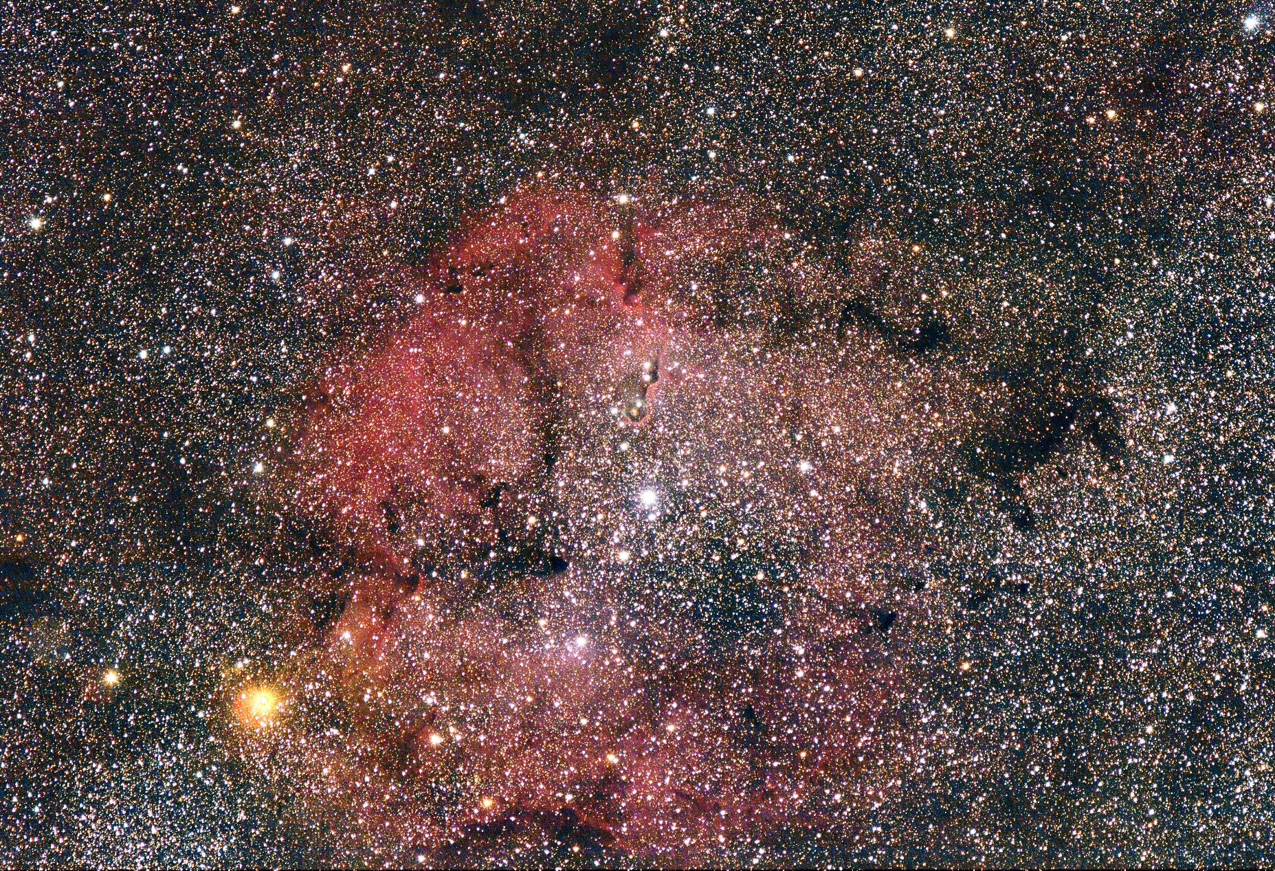 Nebulosa ad emissione con, al suo interno, un vasto ammasso aperto e varie nebulose oscure (globuli di Bok, regioni di prossima formazione stellare). Tra queste ultime spicca la caratteristica "Proboscide di Elefante". Sono 50 pose da 3 minuti a 1600 ISO con obiettivo Sigma da 300mm/f4. Elaborazione con Pixinsight e Photoshop. Località: Castell’Azzara (GR)