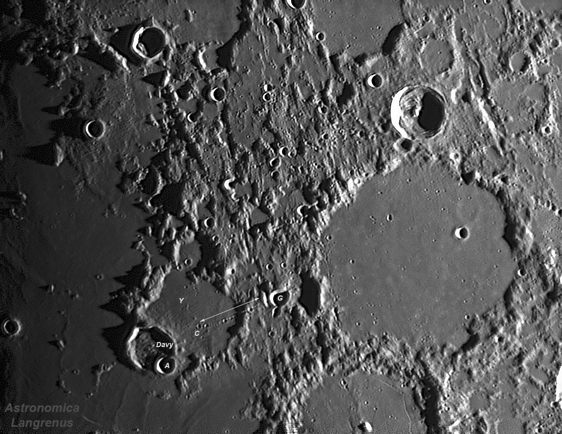 Fase lunare 8,8 giorni, illuminazione 56,6%. Lato orientale mare Nubium. Allineamento di piccoli crateri (da 1 a 3 km) da Davy-C (3 km) a Davy-G (16 km). Estensione 50 km. Telescopio Mak Rumak 255 mm F20 + I.S. DBK41 raw colori, no filtri. Media di 200 su 1000 frames totali. Esposizione 1/9 a 7,5 FPS per 02′ 13", Gain 600, Y800/RGB24. Elaborazione video Registax, Wavelets, Maxim, Photoshop. www.luna.e-cremona.it