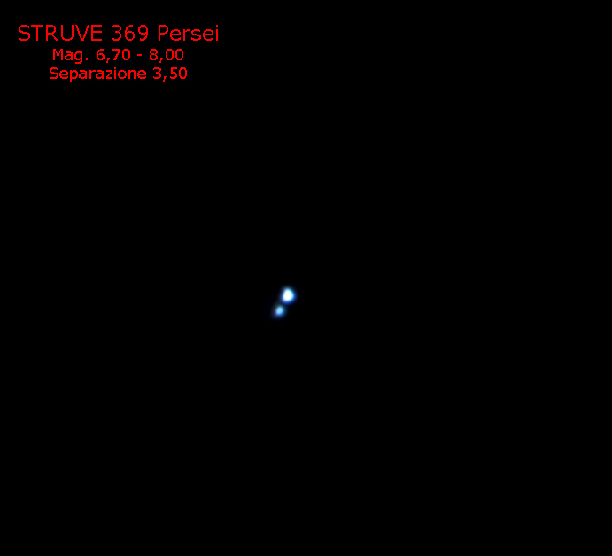 Stella doppia Struve 369 Persei. Magnitudini 6,70/8,00. Separazione 3,50. RA 03 17.2, Dec +40 29. Telescopio Mak Rumak 255 mm F20 + I.S. DBK41 raw colori, no filtri. Esposizione 1/5 a 3,7 FPS per 02′ 15". Gain max, Y800/RGB24. Media di 55 su 200 frames totali. Elaborazione video Registax, Wavelets, Photoshop.