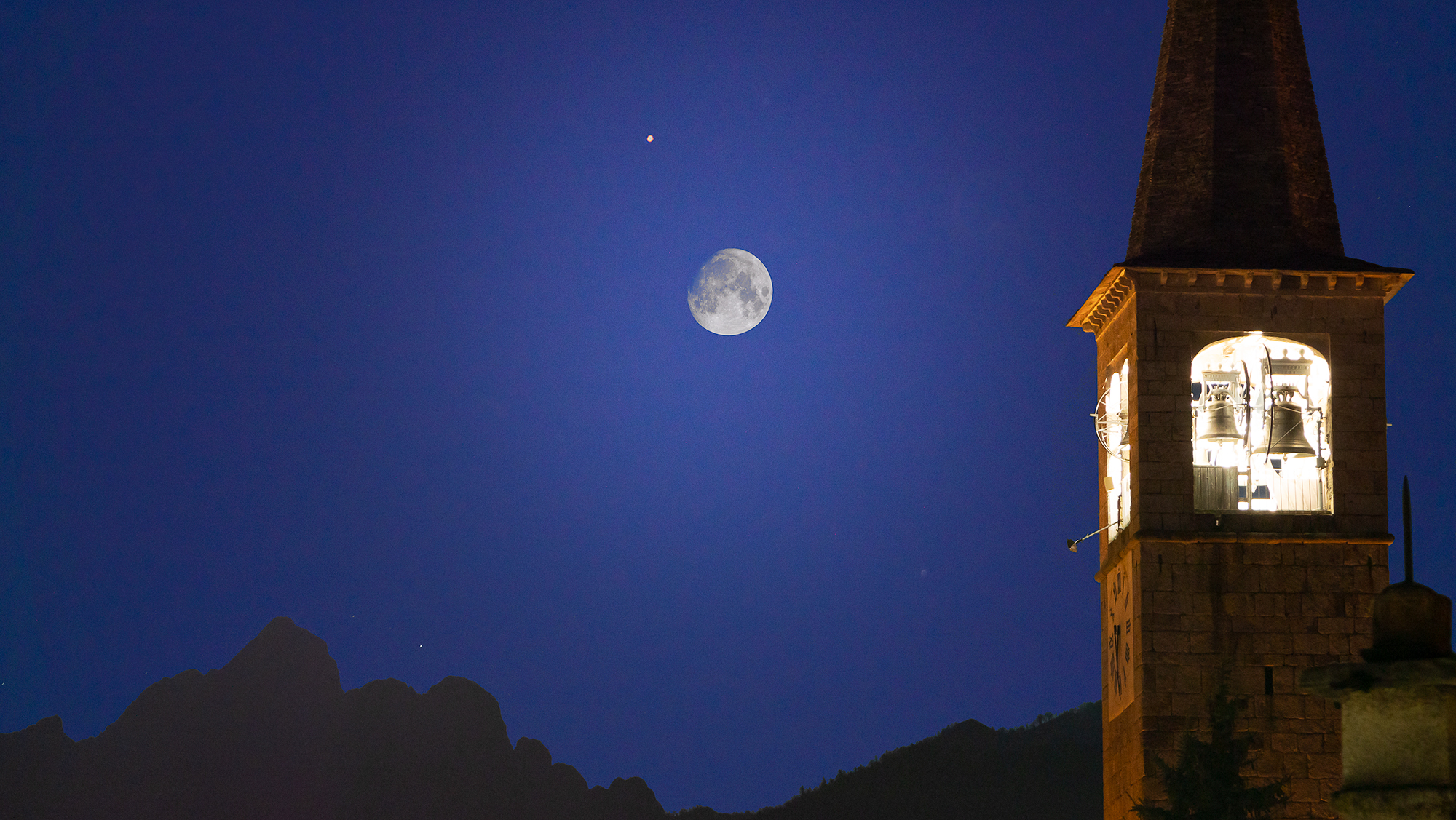Congiunzione tra la Luna quasi piena e Marte sopra i cieli di Malesco in Valle Vigezzo (VB). Scatti realizzati con una Panasonic G9 e obiettivo Olympus 75-300.