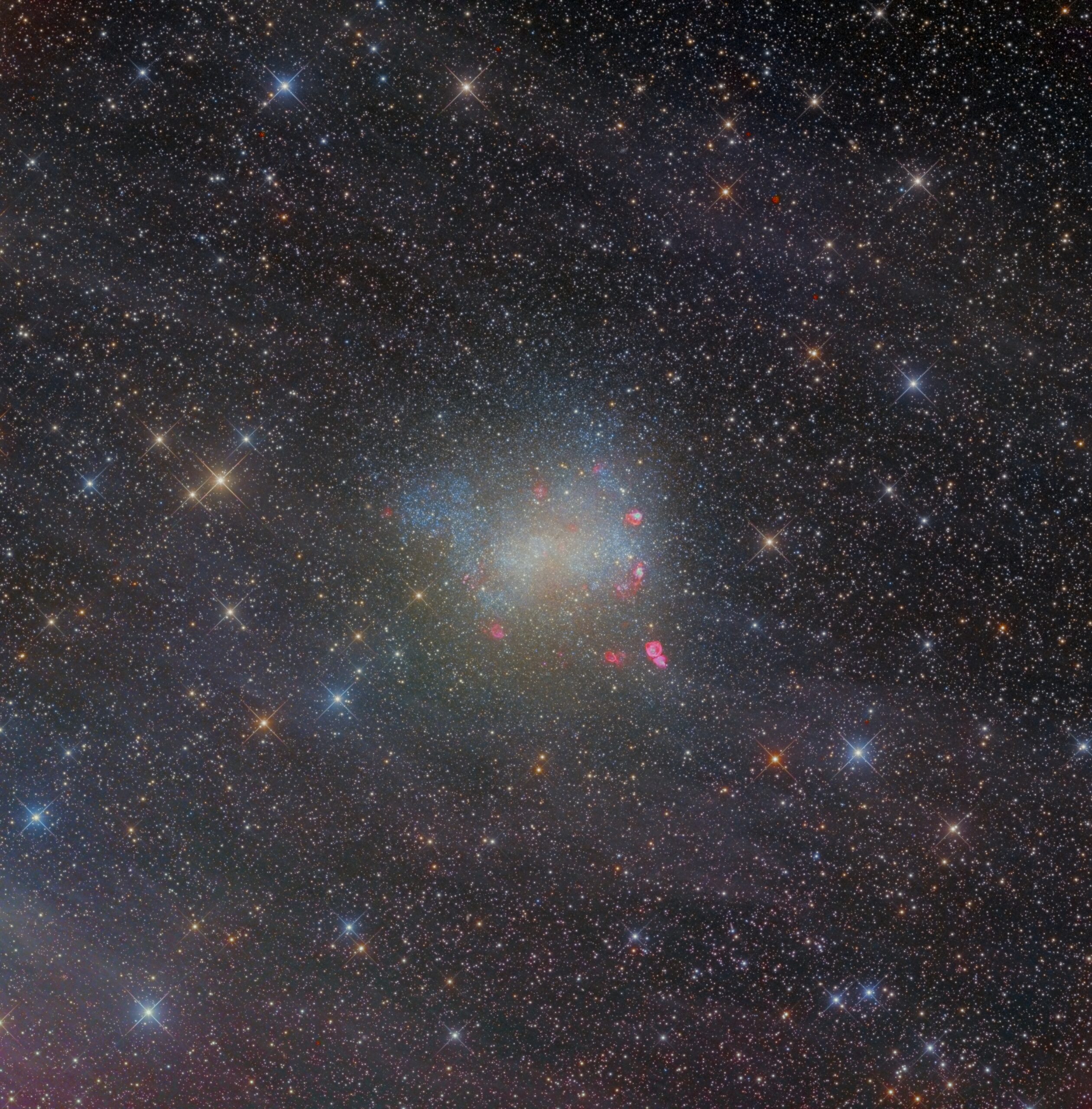 Galassia irregolare in Sagittario; visibili le zone di emissione in Halfa e anche le deboli velature di IFN che la circondano.