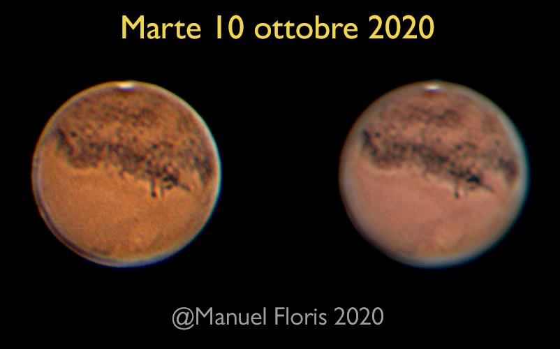 Marte ripreso con un Celestron CPC800. Nell’immagine di sinistra si evidenziano bene le varie zone della superficie del pianeta, mentre a destra si intravede l’atmosfera e le sue deboli formazioni nuvolose.