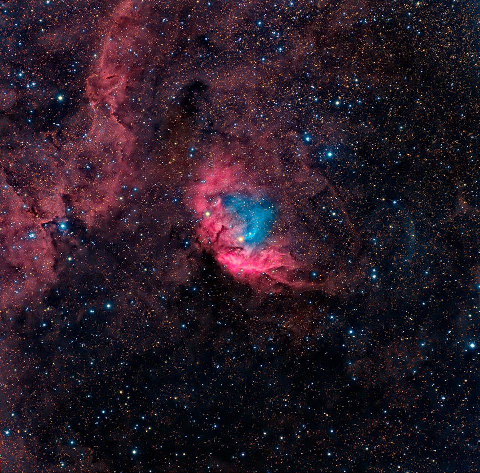 Come sempre mi piace riprendere e comporre in varie palette le nebulose, è sempre affascinante le diverse prospettive che le diverse composizioni offrono , sempre Sh2-101 Tulipan nebula nel cigno , versione H-OIII-OIII , ripresa a Luglio 2017 con 80 triplet tecnosky ridotto a 380mm f4.75 su eq6 eqmodded e ccd SXVR-H16 operante a -15c° , autoguida scopos 66 ed e Orio SSAG , sub frame da : Halfa 6nm 15x1200sec bin 1×1, OIII 6nm 15x1200sec bin 1×1, .Montatura , ccd ,guida totalmente gestite da Voyager