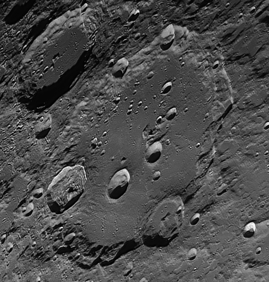 Il grande cratere Clavius – dettagli della superficie lunare Questa immagine mostra uno dei crateri più spettacolari della superficie della Moon: il maestoso Clavius, situato nell’emisfero meridionale lunare. Con un diametro di circa 225 km, Clavius è uno dei crateri da impatto più grandi visibili dalla Terra. La sua caratteristica più distintiva è la spettacolare catena di crateri interni disposti ad arco, generati da impatti successivi che si sono verificati dopo la formazione del bacino principale. Nell’immagine si distinguono chiaramente diversi di questi crateri secondari, tra cui Clavius D, Clavius C e Clavius N, che creano la tipica sequenza decrescente di dimensioni che rende questa regione lunare particolarmente affascinante per gli osservatori. Il fondo relativamente liscio del cratere contrasta con i ripidi rilievi del bordo, modellati da miliardi di anni di impatti meteoritici. Le lunghe ombre evidenziano la morfologia del terreno e permettono di percepire la profondità e la complessità geologica di questa antica struttura. L’immagine è stata acquisita il 27 febbraio 2026 dal terrazzo di casa utilizzando: Telescopio Celestron CPC (Schmidt-Cassegrain da 280 mm) Filtro IR Pass 685 nm, utile per migliorare la stabilità dell’immagine riducendo gli effetti della turbolenza atmosferica Camera planetaria ZWO ASI678MM La ripresa è stata effettuata tramite acquisizione video ad alta velocità e successivo stacking delle migliori immagini, una tecnica che consente di estrarre i dettagli più fini della superficie lunare.