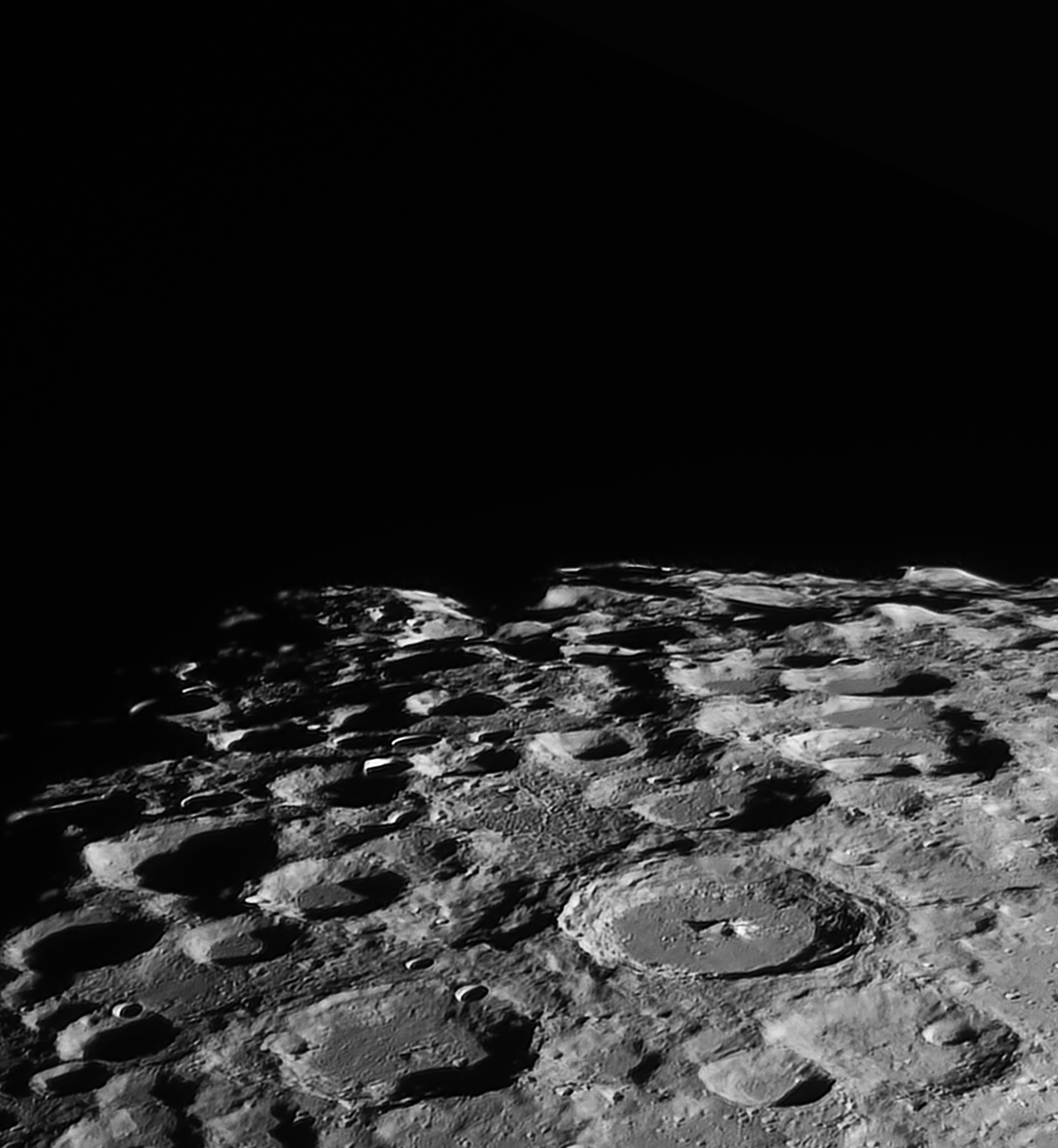 L’immagine riprende il polo sud lunare con il cratere imponente Moretus, con le sue pareti terrazzate, il suo picco centrale imponente e un contesto di crateri vicini, Cysatus, Gruemberger, Curtius. I rilievi sul bordo – presumibilmente creste residue – aggiungono profondità e testimoniano l’intensa attività d’impatto in questa regione. L’atmosfera visiva è quella di un paesaggio lunare crudo, con superfici frastagliate, strutture stratificate dei terrazzi e dettagli topografici finemente illuminati dal Sole radente.