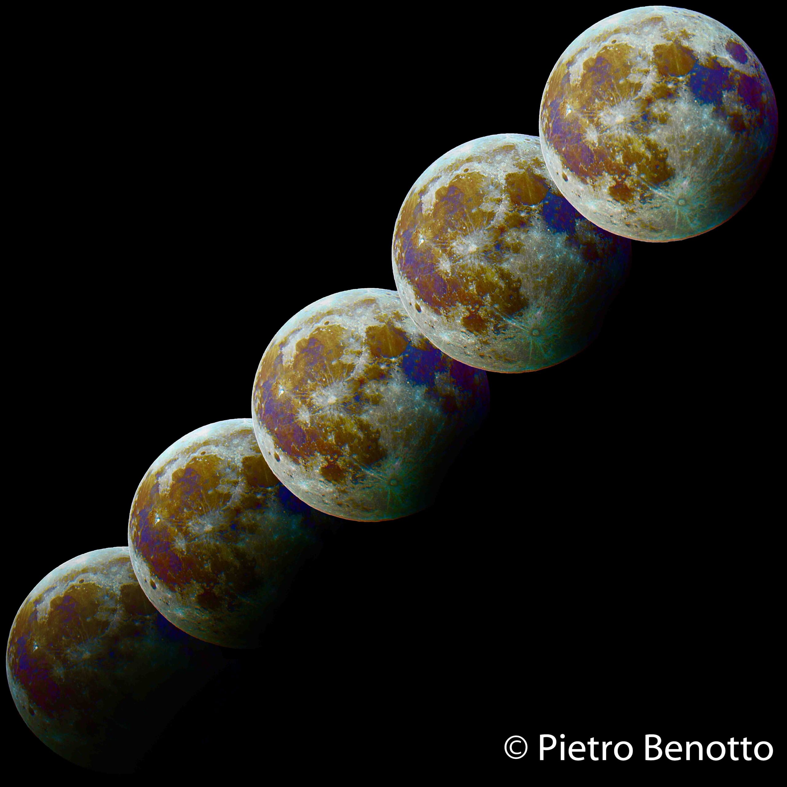 Durante l’eclissi del 7 Agosto, nonostante la Luna fosse molto bassa sull’orizzonte, sono riuscito a raggiungere una discreta risoluzione mediando 15 foto scattate in rapida sequenza. Ecco qui le principali fasi dell’eclissi. Nelle varie foto ho anche aumentato la saturazione per far emergere i tenui colori della superficie lunare formata da minerali differenti.