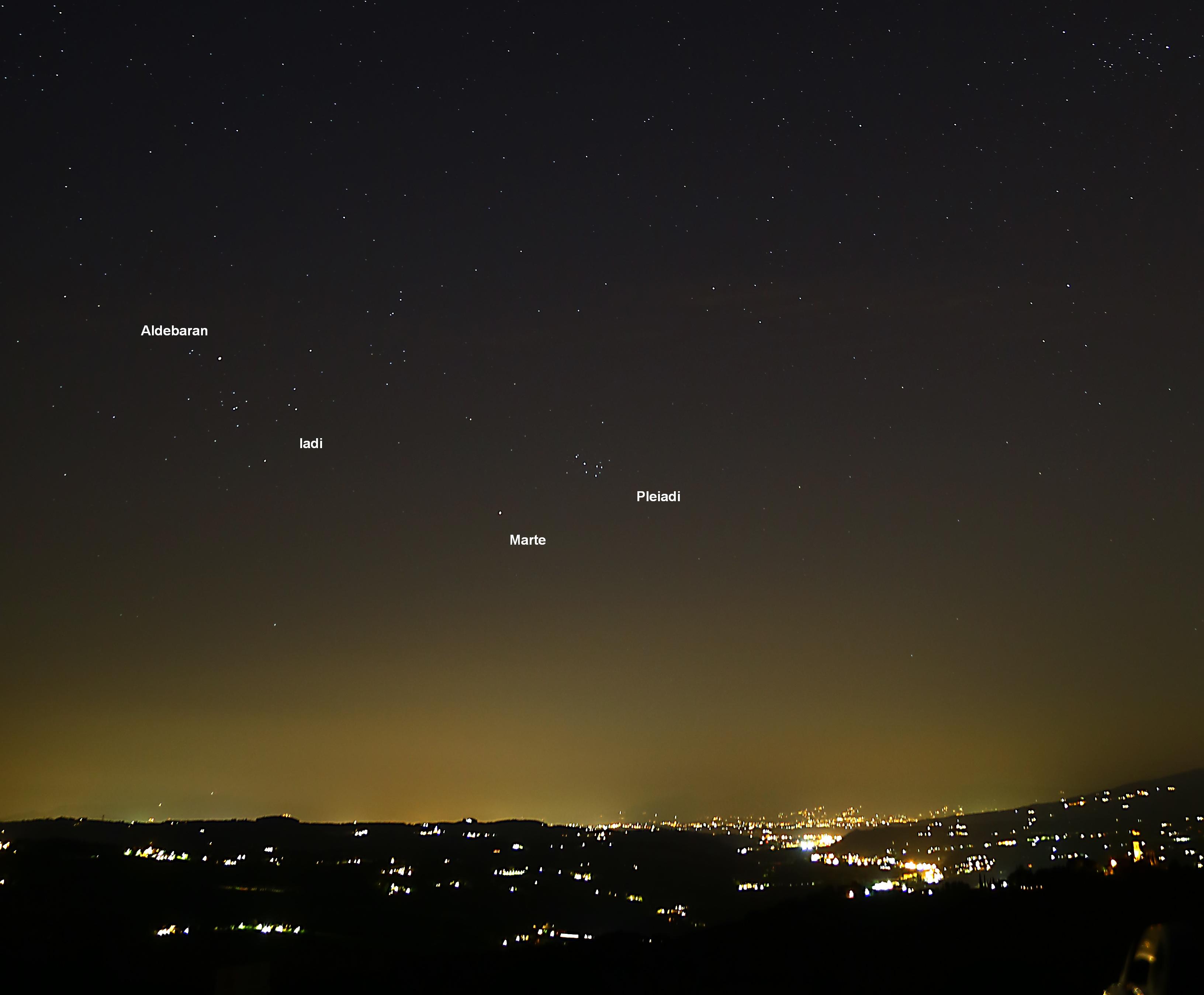 Panorama dominato dall’inquinamento luminoso con al di sopra la congiunzione di Marte con le Pleiadi