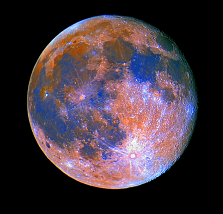 La foto ritrae le tonalità colorate che il nostro satellite naturale possiede realmente le quali derivano dalla composizione geologica della superficie lunare. Somma di 100 scatti elaborati separatamente per il colore e la luminanza ed infine fusi insieme.