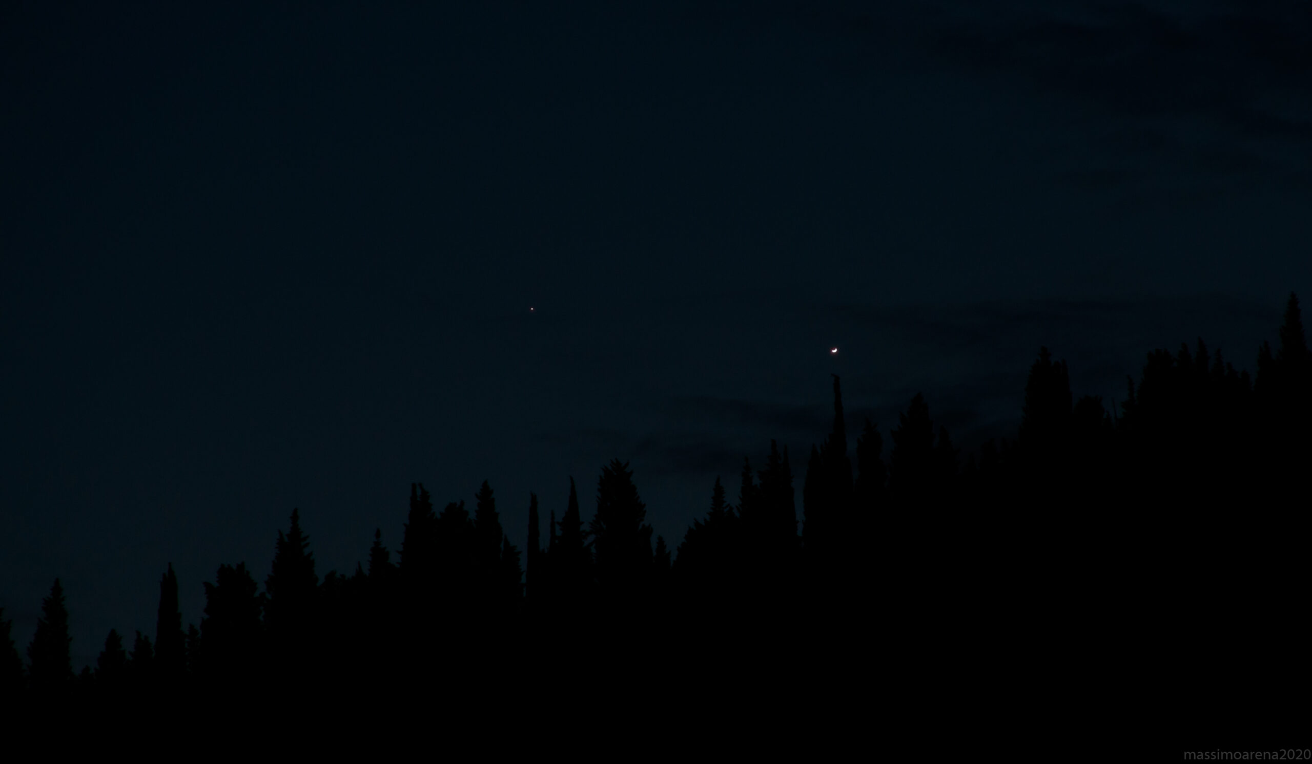 Venere e Mercurio in congiunzione la sera del 22 maggio 2020, ripresa dalle colline tra Sesto Fiorentino e Settimello (Fi)