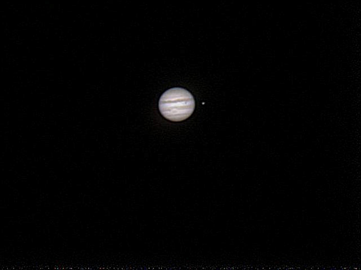 Buon seeing da 1.100m sulle Alpi piemontesi. Somma di 400 frame acquisiti da telescopio newtoniano. Europa sta transitando su Giove, mentre Ganimede ha appena terminato il suo paasaggio. Si notano anche la GRS e altri particolari (piccola macchia marrone a W).
