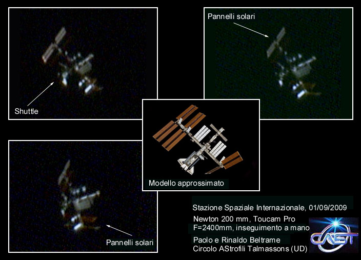 Lo shuttle Discovery attraccato alla stazione ISS. Inseguimento manuale con Newton Marcon da 200mm, barlow 2x, Toucam