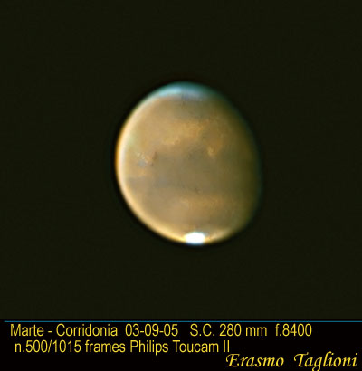 Marte. Marte. Ancora piuttosto basso, ma in una serata dal seeing discreto. C.11-barlow APO 3X. Corridonia Centro Storico