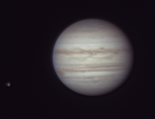 Nell’immagine si può vedere Giove e Ganimede ripresi in una tersa mattina di fine giugno. Sul bordo di Giove sta spuntando la Grande Macchia Rossa l’anticiclone più grande del nostro sistema planetario, a destra di Giove si può vedere un piccolo dischetto, esso non è altro che Ganimede il suo satellite più grande che supera in diametro persino Mercurio, sul suo piccolo disco si scorge un punto luminoso in basso ebbene esso è il cratere Osiride.