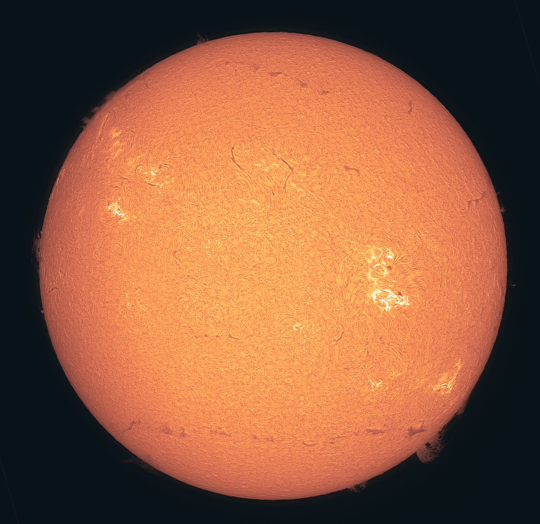 Il sole ripreso con il nuovo rifrattore Acuter Elite Phoenix 40mm. Pur avendo una piccola apertura (il filtro Etalon ha un diametro di soli 40mm) la banda passante ristretta a 0,6 Angstrom garantisce un ottimo contrasto permettendo la ripresa contemporanea sia dei dettagli della cromosfera solare (filamenti, regioni attive ecc…), sia delle protuberanze che si estendono oltre il globo, il tutto senza dover ricorrere alla composizione di filmati con esposizioni diverse. Rifrattore Acuter Elite Phoenix 80mm f/5 Filtro Etalon 40mm 0,6 Angstrom @f/10. Camera PlayerOne Neptune M 1 minuto @ 60 fps