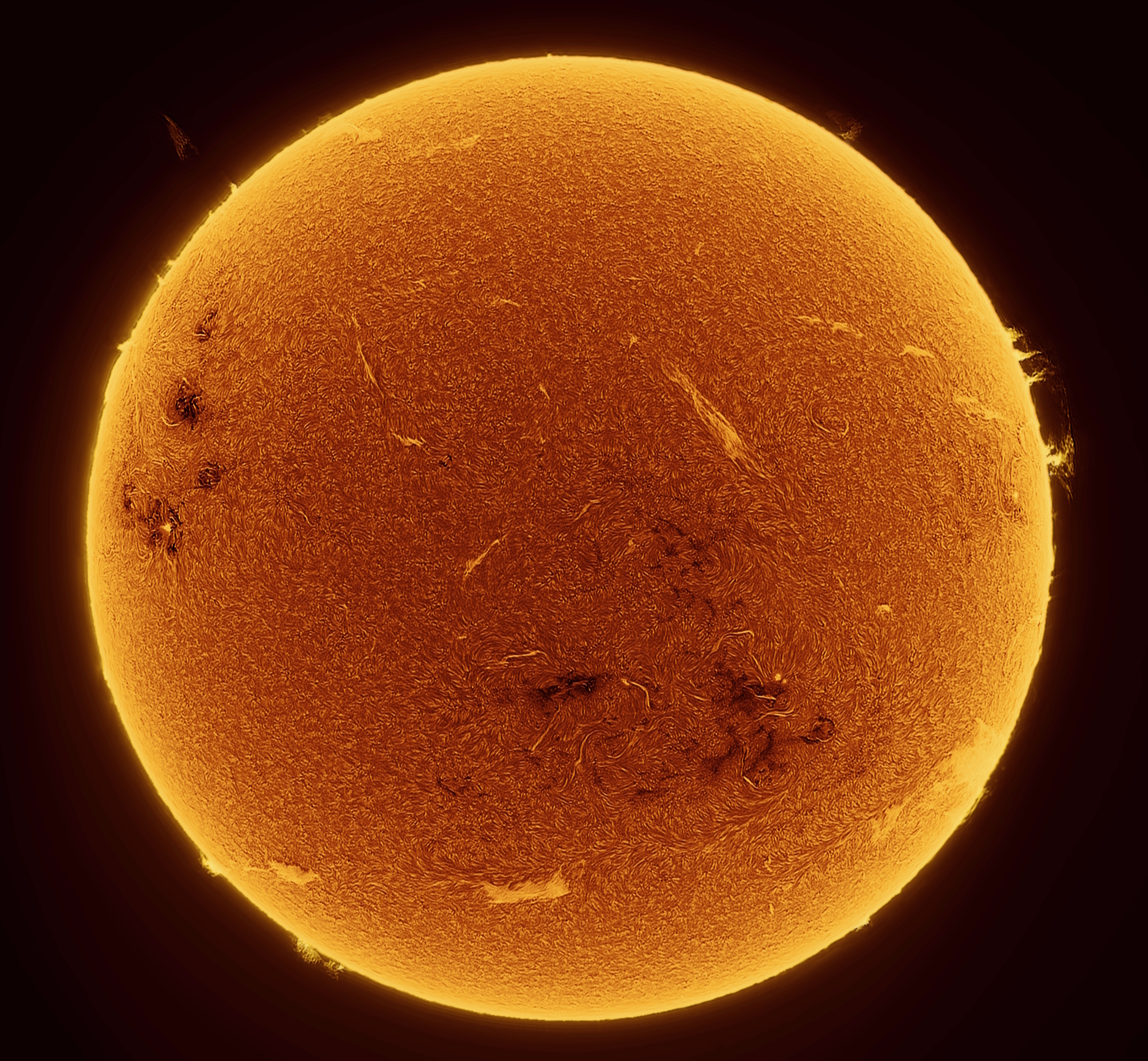 Il sole ripreso con il rifrattore acromatico Acuter Elite Phoenix con filtro Etalon (40mm di apertura, banda passante 0,6 Angstrom). Camera PlayerOne Neptune M Composizione di due filmati da 2 minuti cad @ 70 fps