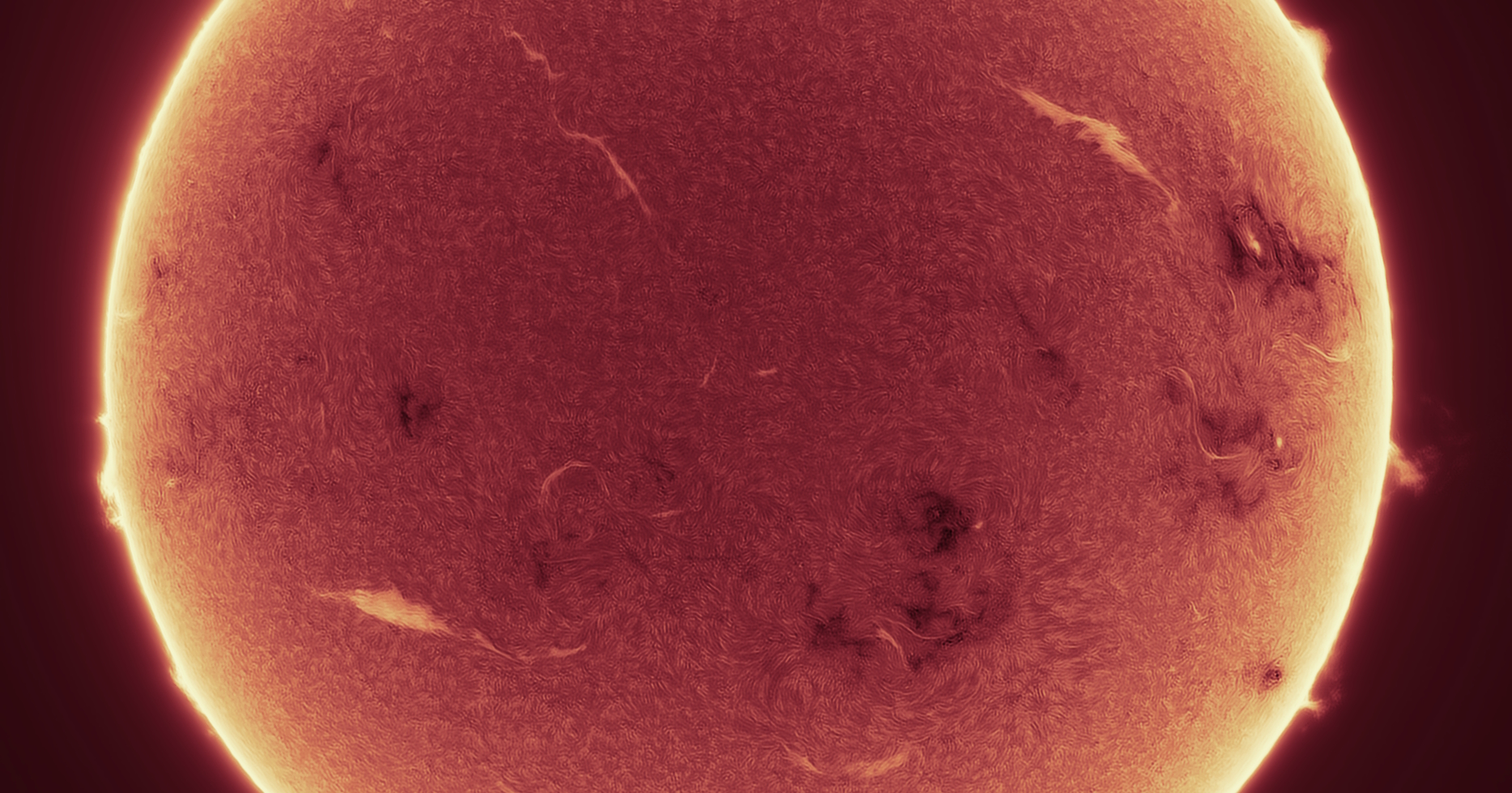 E’ ancora molto intensa l’attività di questo 25° ciclo solare, in particolare la grande regione attiva AR4274 (nell’immagine visibile in prossimità del lembo orientale) ha prodotto diversi brillamenti di classe X ed espulsioni di massa coronale (CME) anche dirette verso la terra causando diverse tempeste geomagnetiche ed inusuali aurore boreali anche a latitudini medie. Rifrattore acromatico Acuter Elite Phoenix @f/10 Filtro Etalon da 40mm di apertura, banda passante 0,6 Angstrom Camera PlayerOne Neptune M Filmato .ser da 2 minuti @ 65 fps