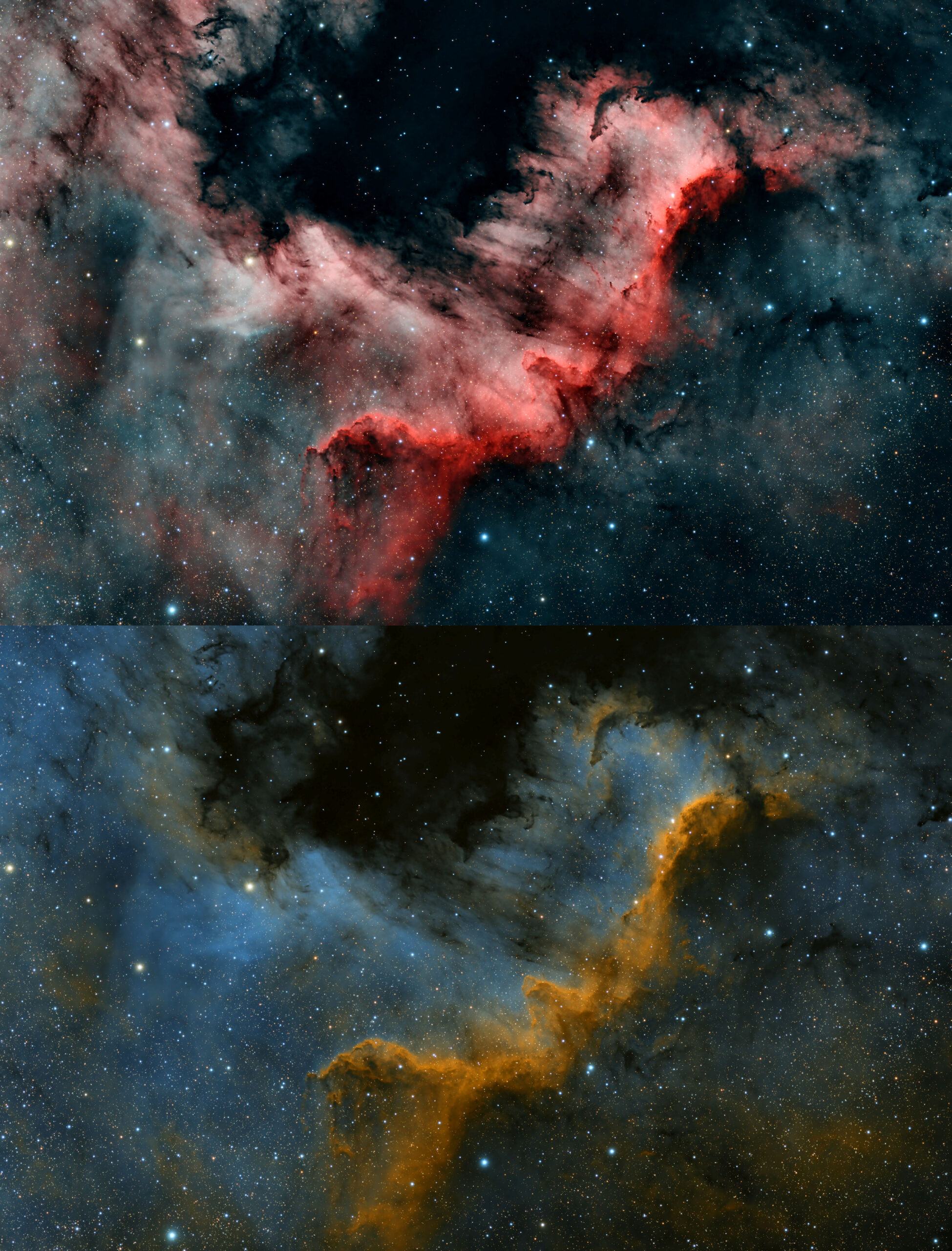 Un soggetto che si presta molto a questo tipo di elaborazioni è il Muro del Cigno, l’area della Nebulosa Nord America (NCG7000) che richiama il profilo delle regioni centroamericane e del Golfo del Messico.