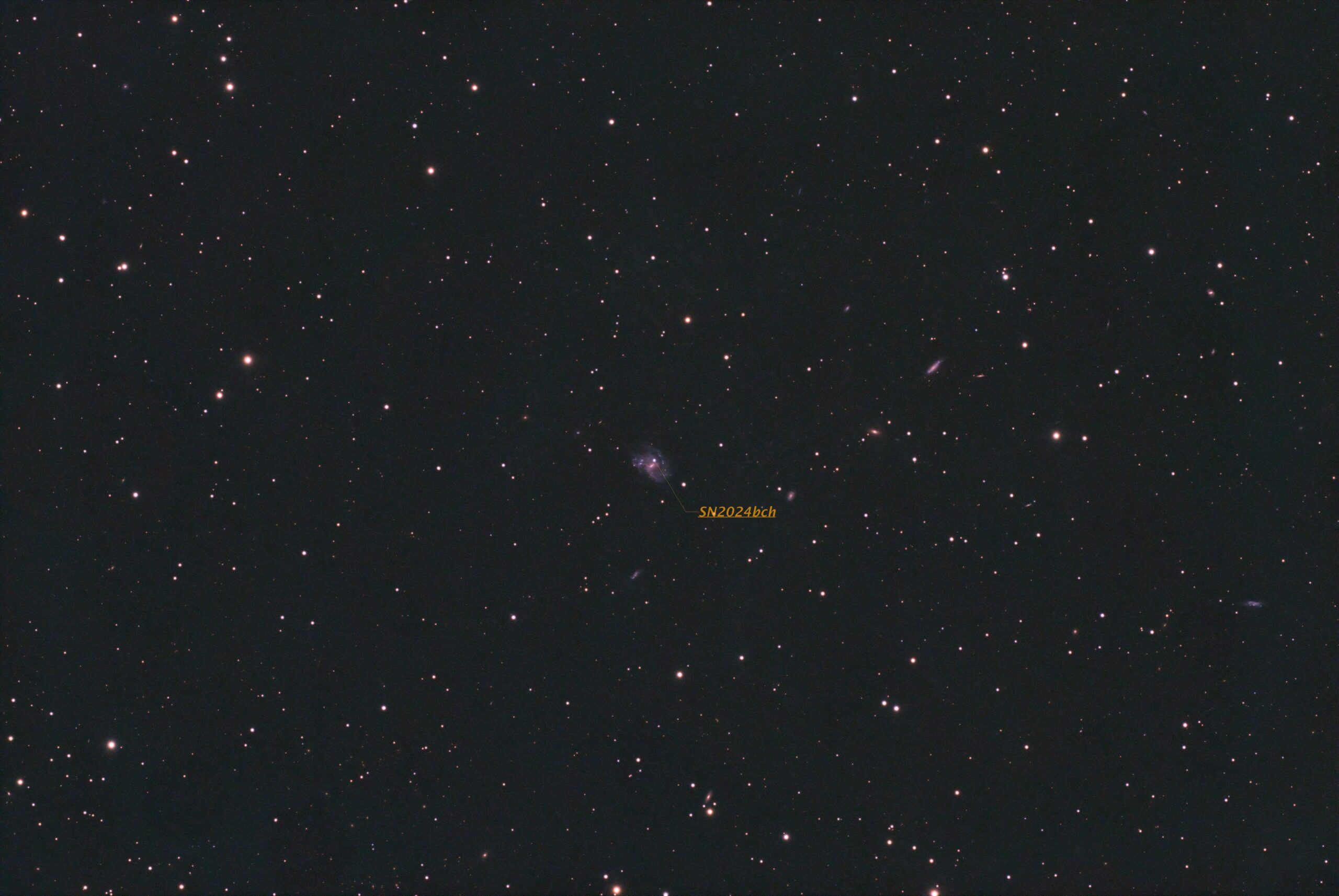 SN2024bch è stata scoperta il 29 gennaio 2024 nella galassia NGC3206 da Patrick Wiggins, uno degli scopritori di supernovae più prolifici dei nostri tempi. Al momento della scoperta la supernova aveva magnitudine stimata 15.5, ma rapidamente è arrivata a ca. 14. Si tratta di una supernova di tipo IIn, una categoria particolare di supernovae che si caratterizzano per la presenza di linee di emissione di idrogeno nel loro spettro. Le immagini raccolte evidenziano la sua forte luminosità rispetto alla galassia che la ospita e al suo stesso nucleo.