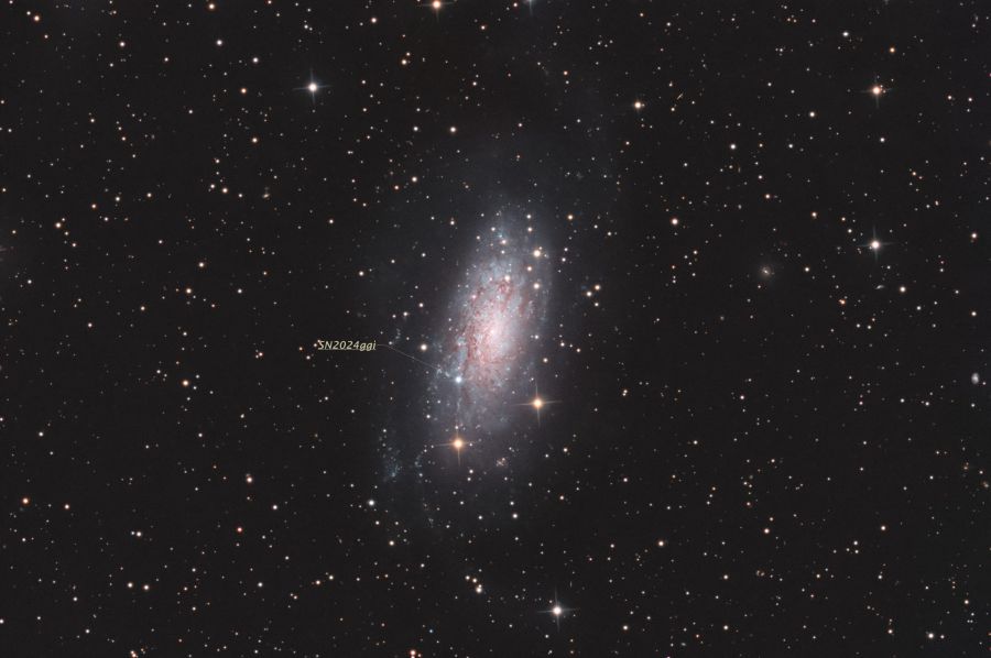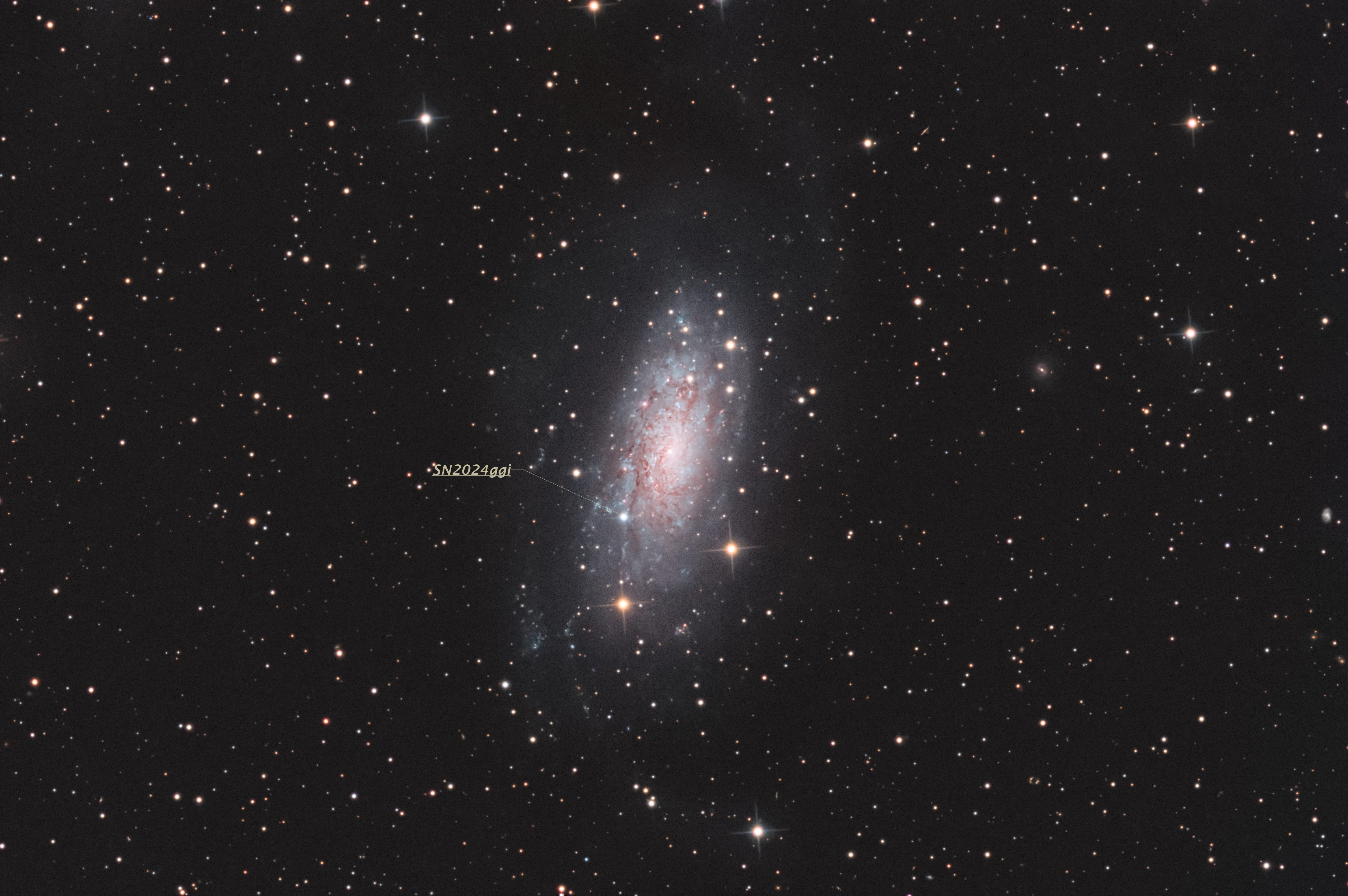 L’11 aprile 2024 è stata scoperta una Supernova di tipo II nella galassia NGC3621 dai telescopi del programma ATLAS. Il nuovo transiente al momento della scoparta aveva una magnitudine di 18.915, che sta però aumentando velocemente. Ho acquisito questa immagine il 15 aprile da un telescopio remoto in Cile, misurando una magnitudine pari a 12 (dato confermato anche da rilievi fotometrici del Gruppo Pan-STARRS il 16 Aprile). Ad oggi è la Supernova più luminosa scoperta quest’anno, e la più vicina alla terra dalla SN2023ixf scoperta in M101 il 19 maggio 2023.