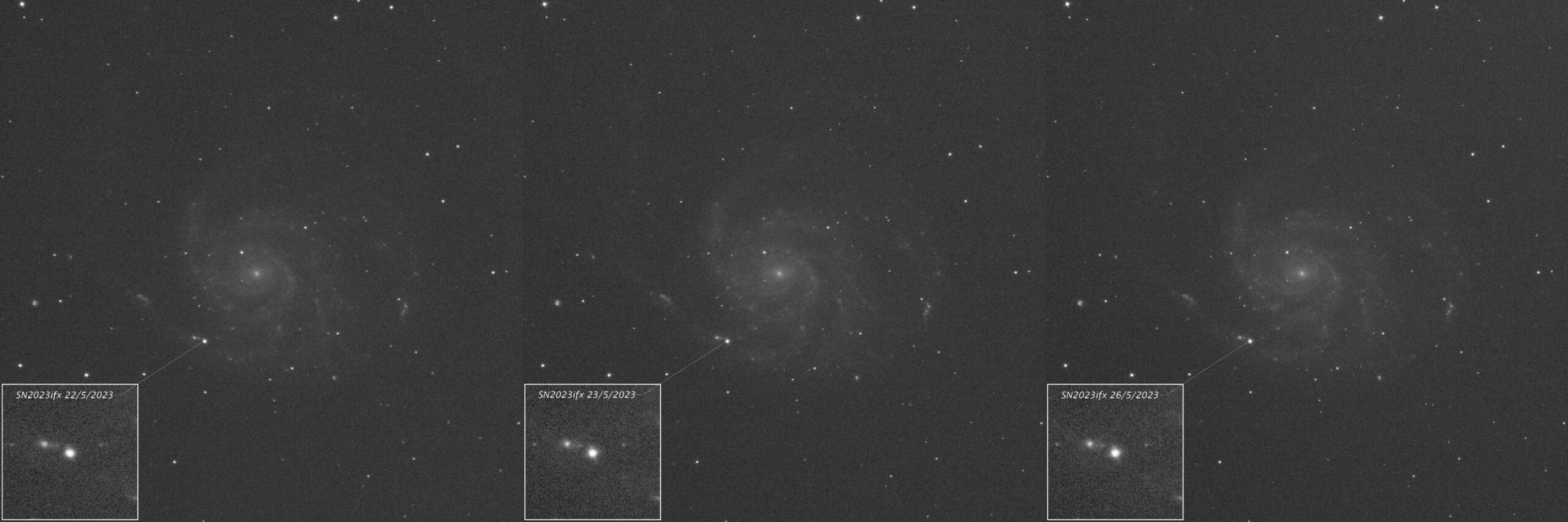 L’immagine mette a confronto tre sub-frames, ciascuno da 5 minuti, ottenuti nelle notti del 22 (sqm 17.75), 23 (sqm 18.96) e 26/5 (sqm 18.93).
